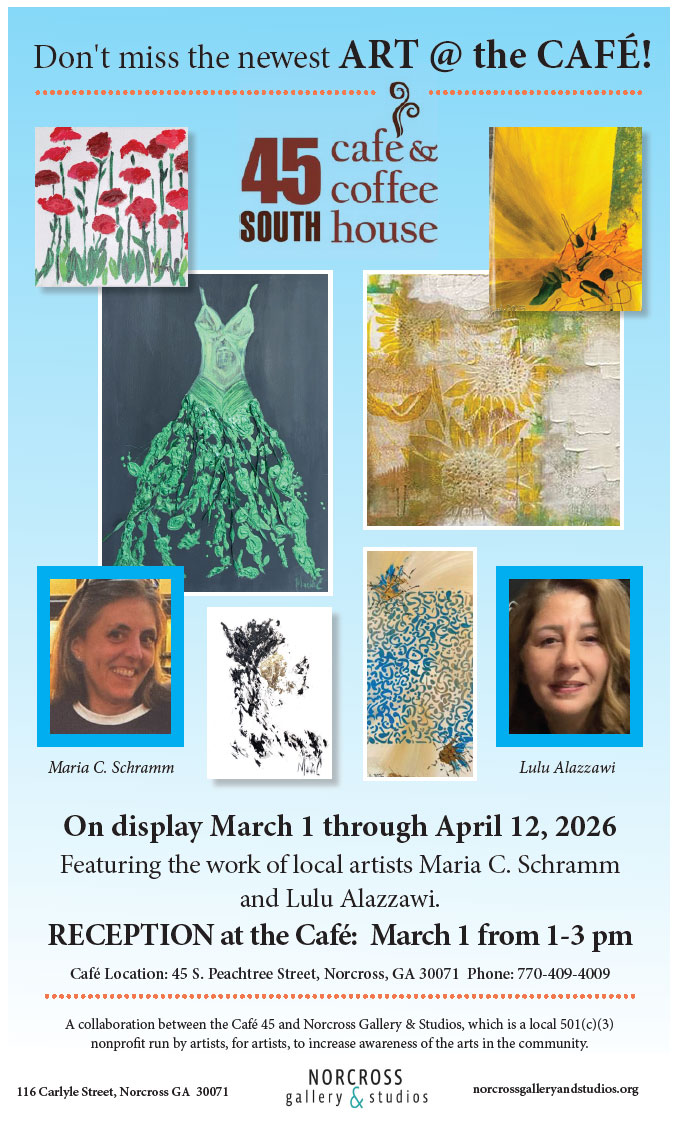 Each month, 45 South Cafe, in Old Norcross will be featuring works by our Artist of the Month. Art and Coffee! It doesnt’t get much better.