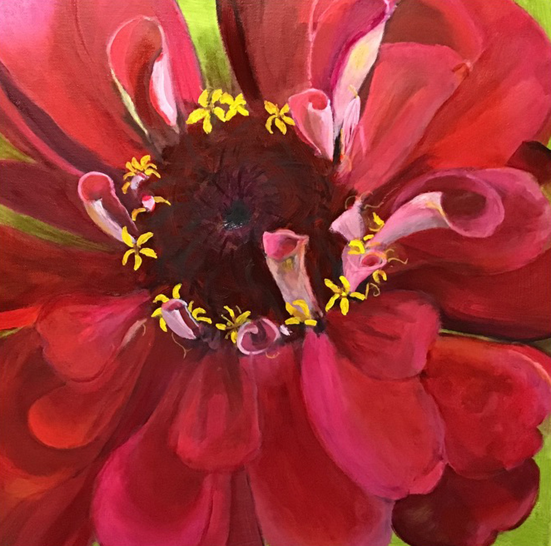 I am mesmerized by the intricacy of a floral bloom. I painted a peony blossom to convey an emotional concept. I was honored that it was chosen for a juried show at the New Britain Museum of American Art in Connecticut. Georgia O’Keefe was my inspiration for painting single flowers in all their glory.